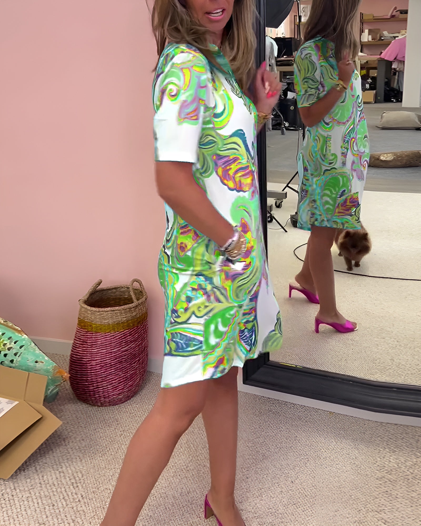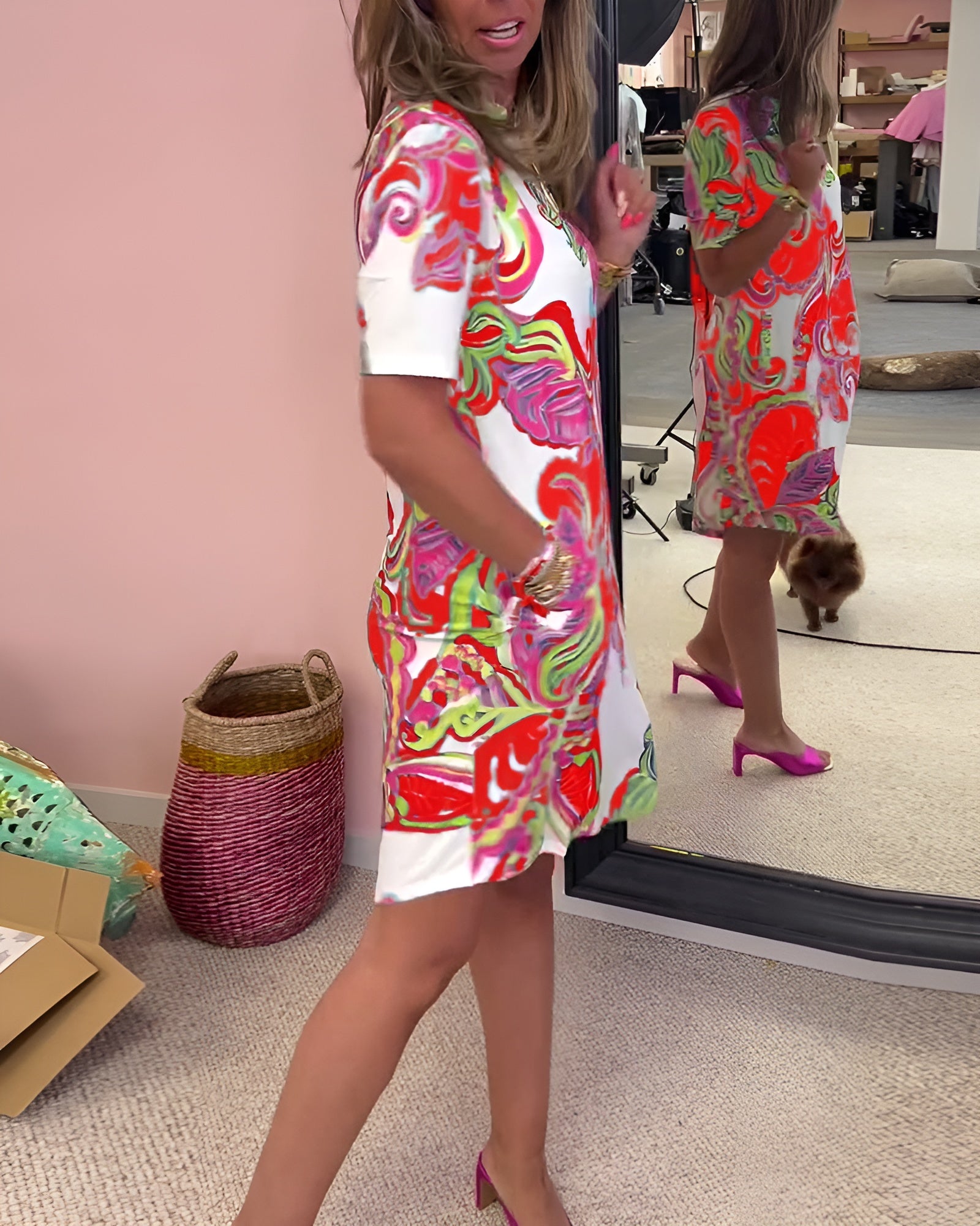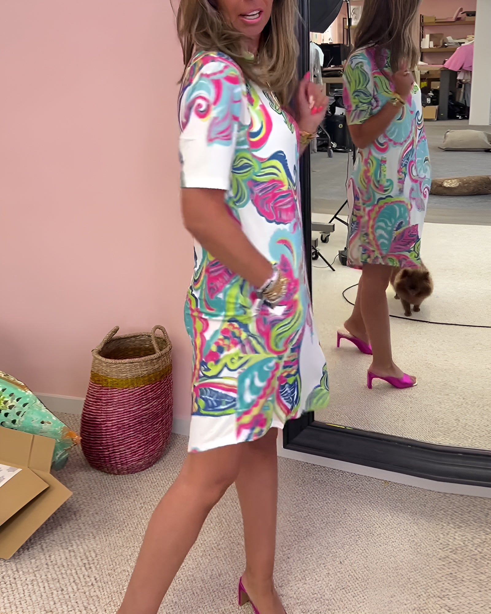 Kevyt, naisellinen ja rennon tyylikäs – tämä mekko on täydellinen valinta kesän arkipäiviin. Hengittävä materiaali tuntuu miellyttävältä lämpimällä säällä, ja imarteleva V-pääntie sekä suora malli tuovat kauniin siluetin. Helppo yhdistellä sandaaleihin tai tennareihin – pukeudu mukavasti ja näytä hyvältä koko päivän!