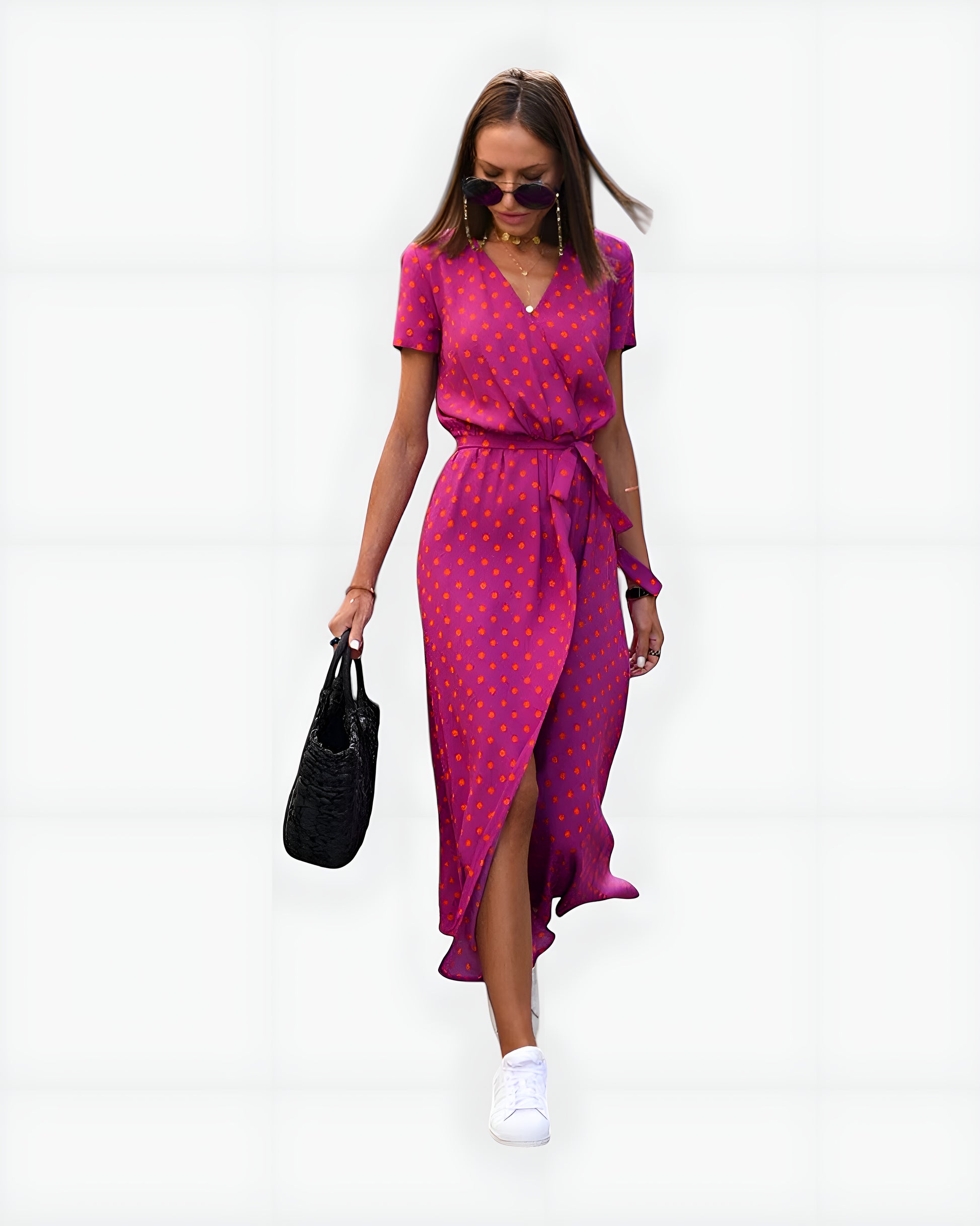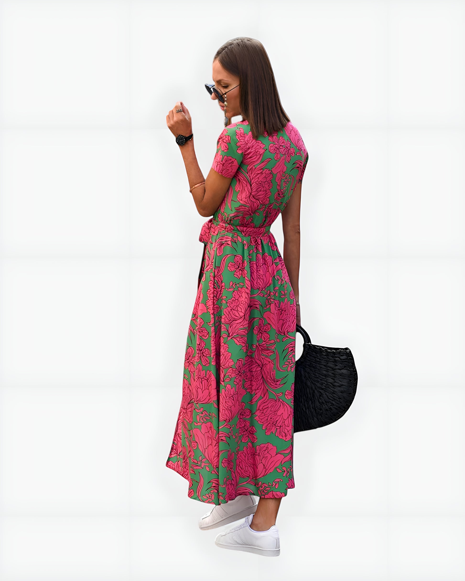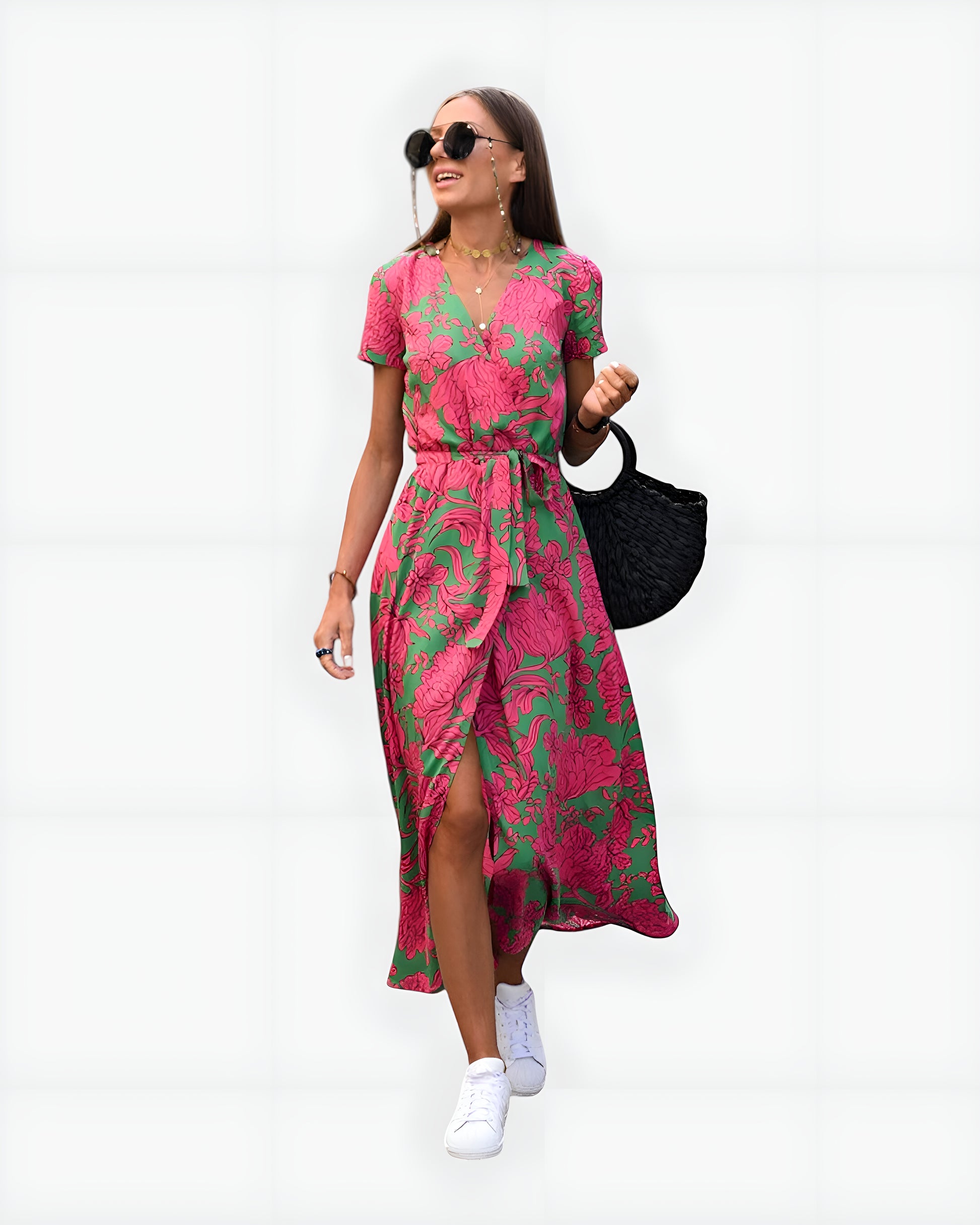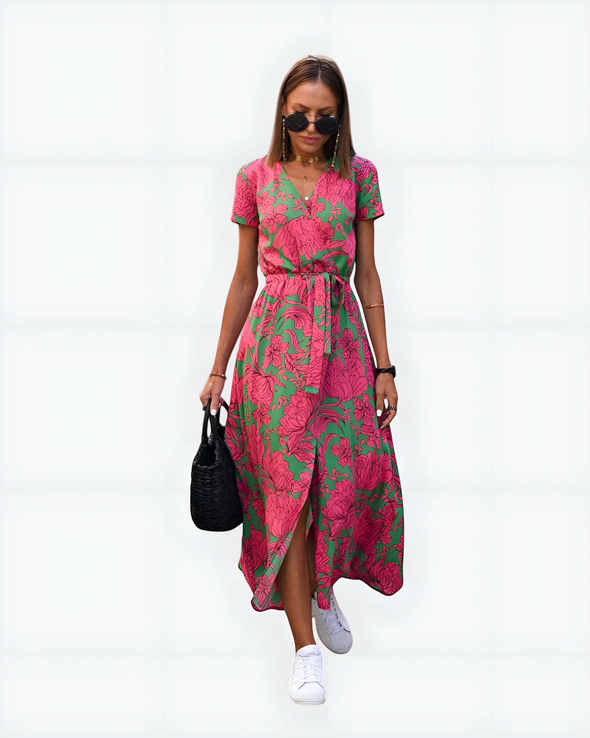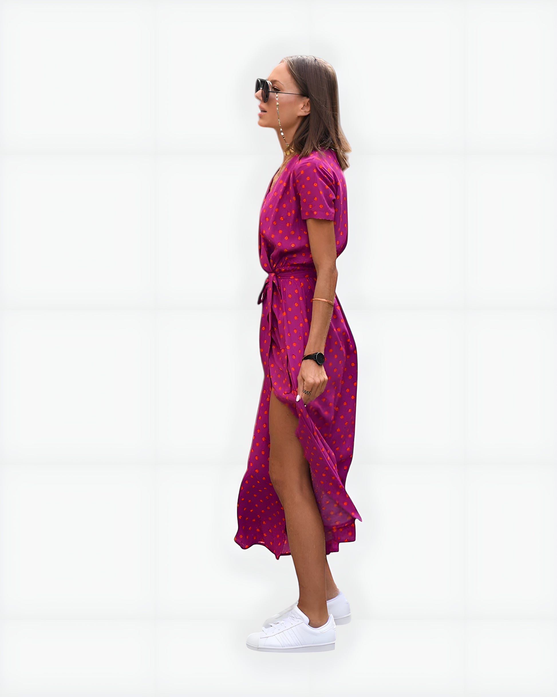V-pääntie ja kevyet laskokset tuovat naisellisuutta ja keveyttä joka askeleeseen.