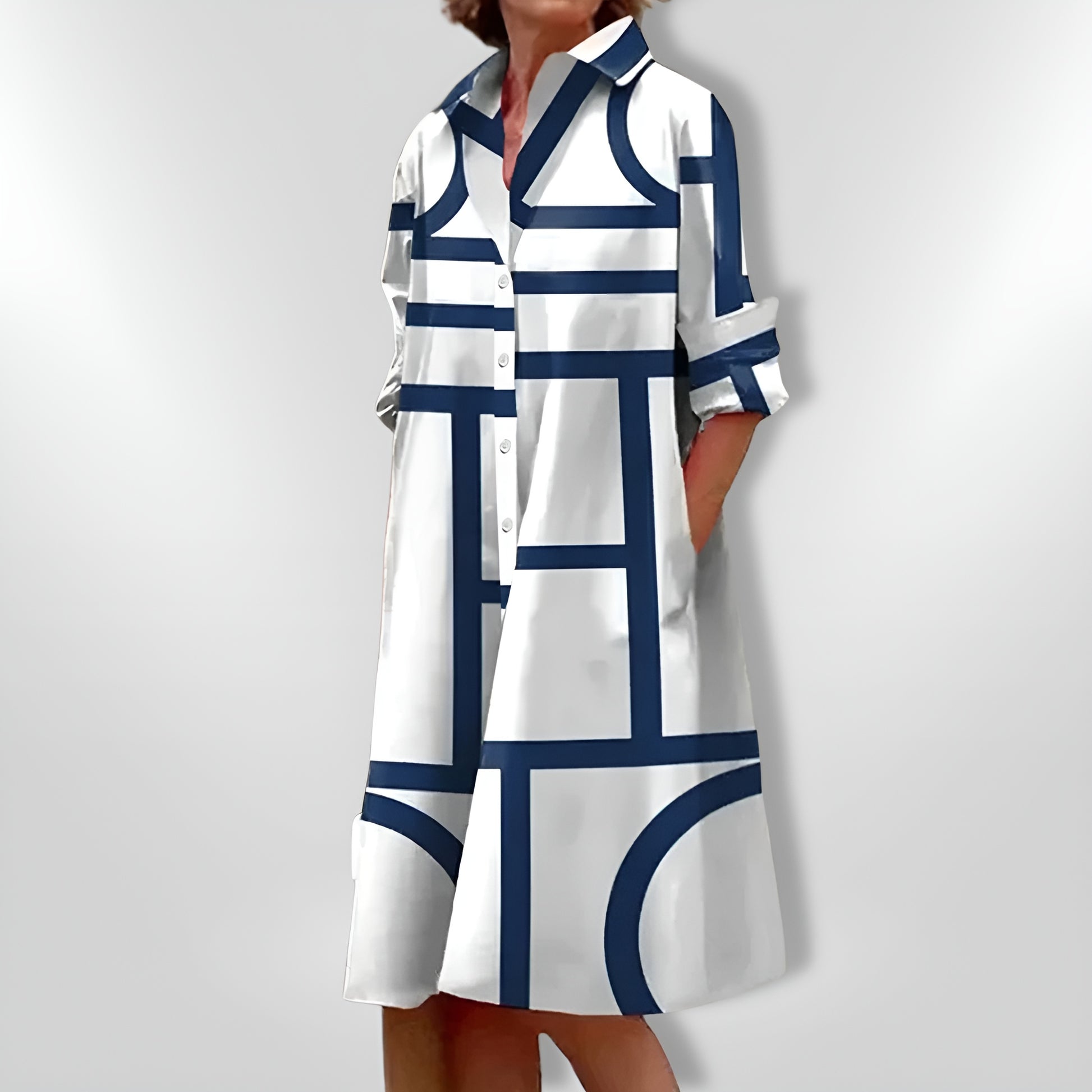 Janika™-mekko yhdistää mukavuuden ja modernin tyylin tavalla, joka tekee vaikutuksen missä tahansa. Rohkea geometrinen kuvio ja väljä leikkaus tekevät siitä täydellisen valinnan, kun haluat näyttää huolitellulta mutta rennolta – niin arjessa kuin erityisissä hetkissä. Piilotaskut ja kauluspääntie viimeistelevät lookin hienostuneella otteella.