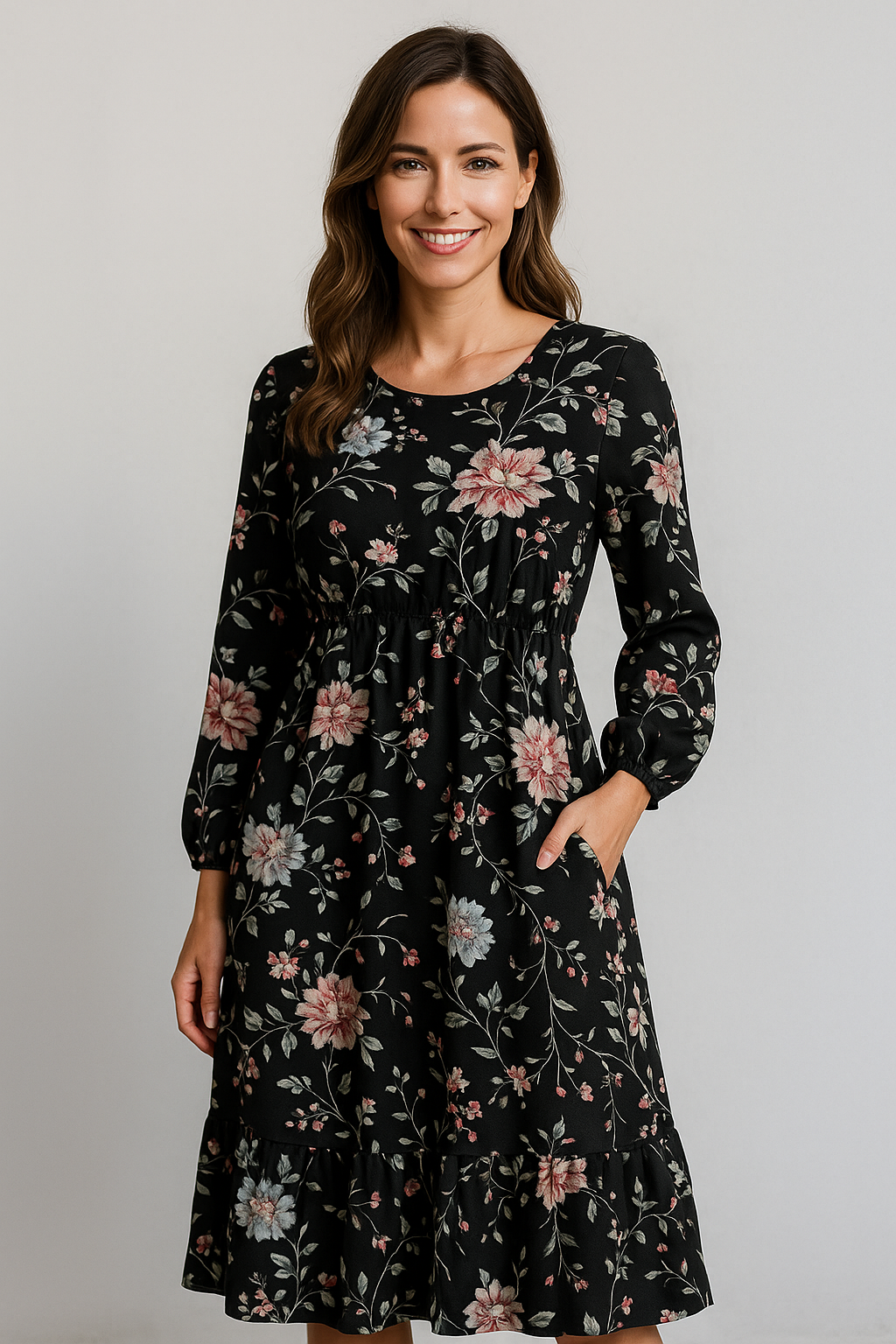 Väljähkö istuvuus korostaa naisellista siluettia pehmeästi. Pituus ja laskostettu helma tuovat liikettä – tunne kuin tanssisit, vaikka vain kävelet.