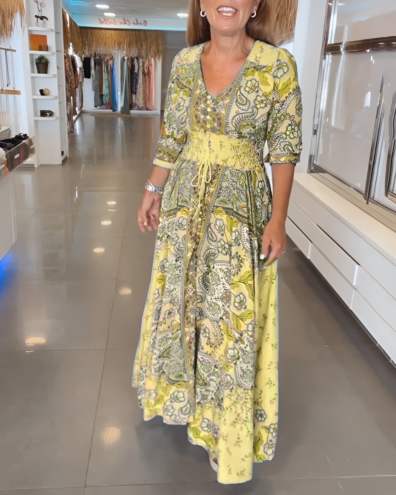 A-linjainen malli, maksipituus ja kiristysnyöri vyötäröllä luovat naisellisen siluetin, joka imartelee jokaista vartalotyyppiä. Mekko hulmuaa kauniisti liikkeessä – oli kyseessä kävely, tanssi tai rentoutuminen.